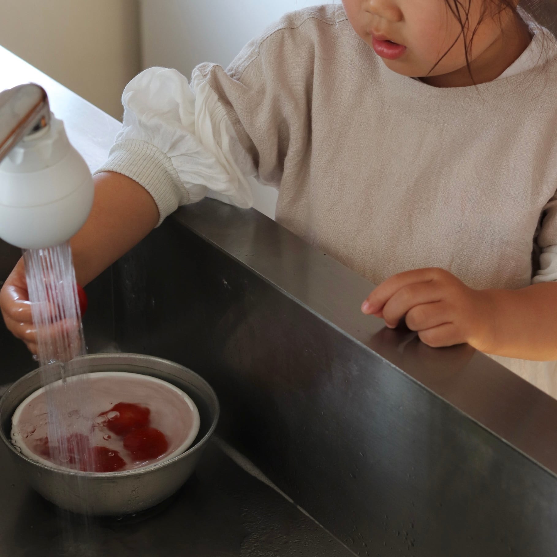 1歳・2歳のお子様がお手伝いに興味を持ち始めたら、ぜひ「Linのリネンかっぽう着」を。