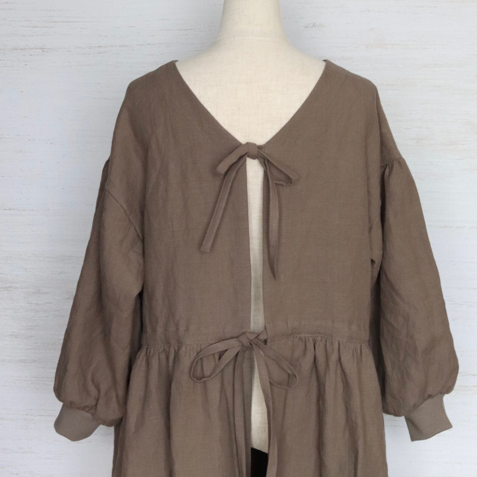 寸法詳細:着丈90〜120cm、バスト98cm、肩巾58cm、袖丈43cm、身頃丈38cm、首あき20cm、袖口巾9.5cm、アームホール直線20cm、後ろ上段リボン位置 首から14cm下